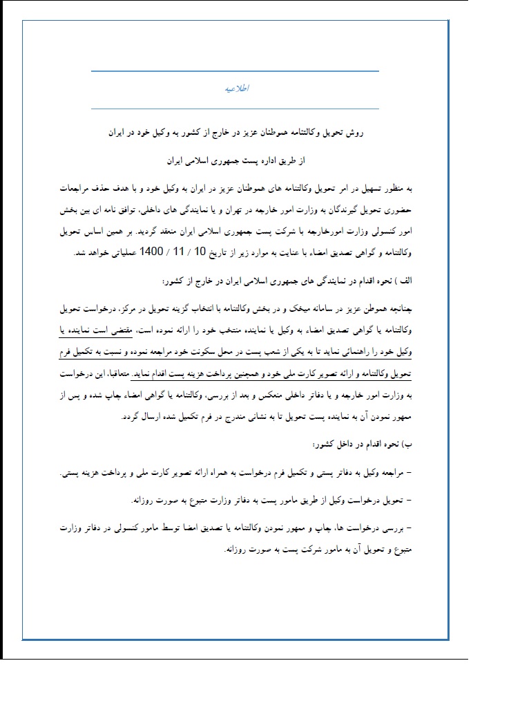 بر اساس توافق صورت گرفته بین بخش امور کنسولی وزارت امور خارجه کشورمان با اداره پست جمهوری اسلامی ایران، تسهیلات لازم بمنظور تسلیم وکالتنامه هموطنان عزیز به درب منزل وکیل خود در ایران فراهم گردید. روش انجام این امر را می‌توانید در اطلاعیه زیر مشاهده فرمائید.